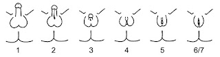 You can see that both of these illustrations include 6 forms, although they number them in reverse order and with different numerals.  What they both show is that between a genital form considered typically female and one considered typically male, there is a common spectrum of intermediate forms.